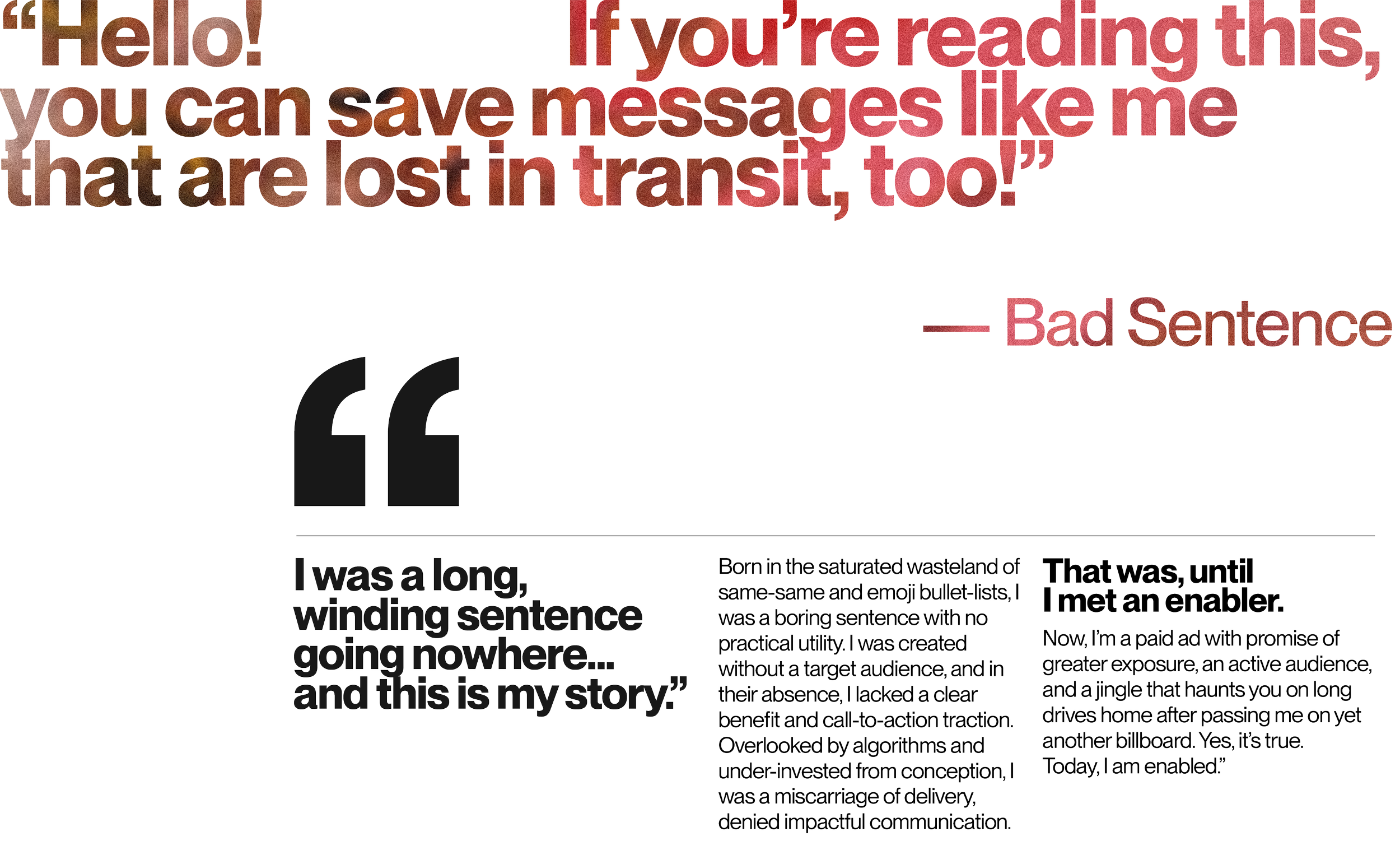 We turn ideas into creative content with resonance. We then create lasting impressions using that connection. That impact, paired with research and strategy, is how we build bold brand voices.